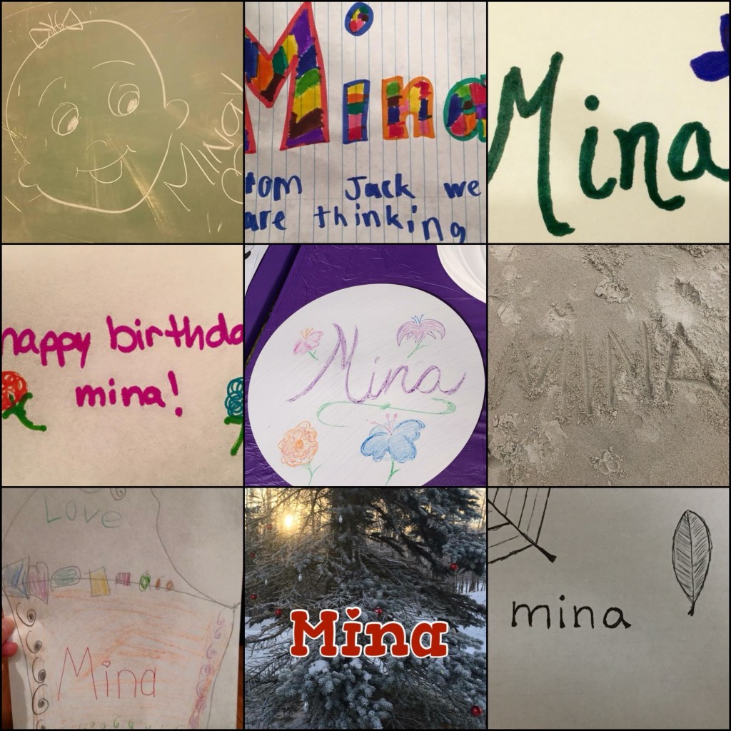 Every year, we get a cake for Mina. We light candles and hold her urn. We mourn another year without her in our arms. For Mina’s first birthday, we wanted to do something memorable. We decided to ask our friends and family to write Mina’s name and send us photos. The response was overwhelming, and we got to see our daughter’s name written hundreds of times in creative and fun ways. From a classroom of teens in Georgia drawing pictures to having her name traced in the snow in Moscow, Mina’s name came from all corners of the earth.